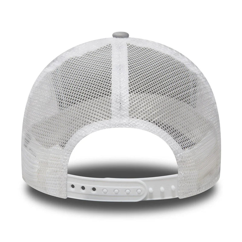 - Rounded crown with grey structured front panels and white mesh rear panels